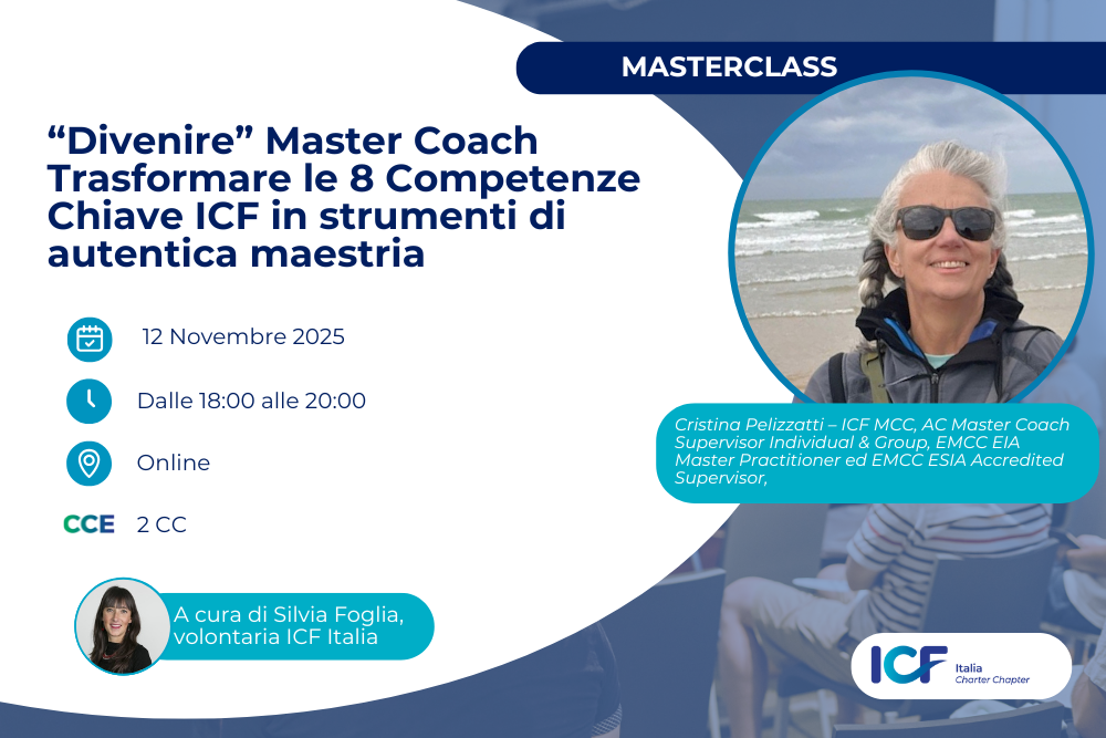 La Master Class “Divenire Master Coach” è un incontro riflessivo e un viaggio di consapevolezza pensato per integrare le 8 Competenze Chiave ICF nello stile professionale di ogni coach.